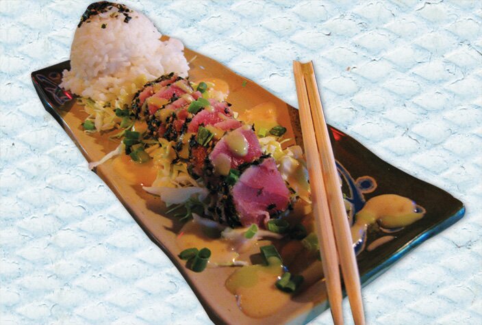 Mouth-watering seared ahi drizzled with lilikoi wasabi sauce and one scoop rice